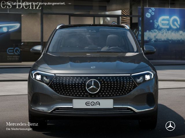 Serienausstattung Unverkennbares Mitglied der vollelektrischen Mercedes-Benz Familie: Außen charakterisieren den EQA die Black-Panel-Kühlerverkleidung, das Leuchtenband an Front und Heck sowie blaue Elemente in den LED-Scheinwerfern. Innen weist das intelligente MBUX Multimediasystem den Weg zur nächsten Ladesäule.