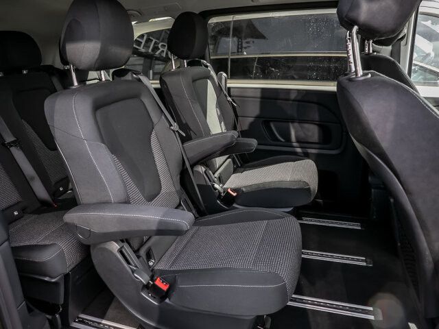 Schriftzug Einstieg Mercedes-Benz beleuchtet Die beleuchteten „Mercedes-Benz“ Schriftzüge mit Edelstahlblende vermitteln Exklusivität bereits beim Einstieg. Beim Öffnen der Fahrer- und Beifahrertür werden die Schriftzüge vorn beleuchtet, beim Öffnen der vorhandenen Schiebetüren auch hinten.