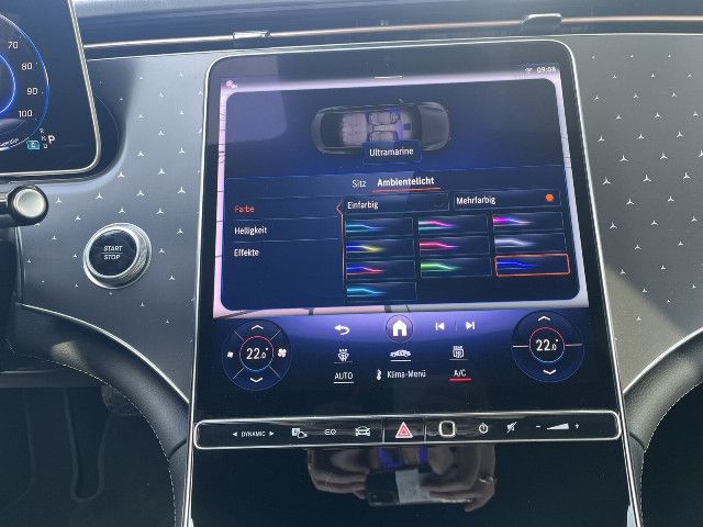 Ein Kunstwerk aus Licht: Im Zusammenspiel mit der Ambientebeleuchtung erstrahlt das Mercedes-Benz Pattern auf der Instrumententafel in Ihrer Wunschfarbe. Diese faszinierende Inszenierung verleiht dem Innenraum eine futuristische Tiefe und schafft eine Atmosphäre von moderner Eleganz.